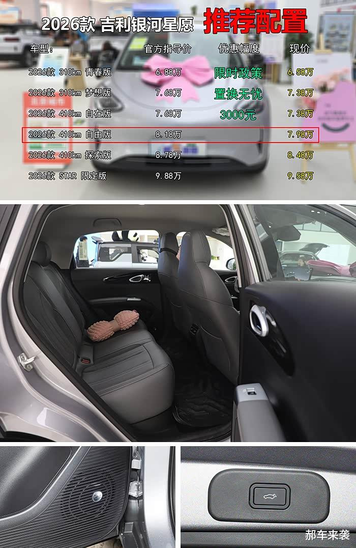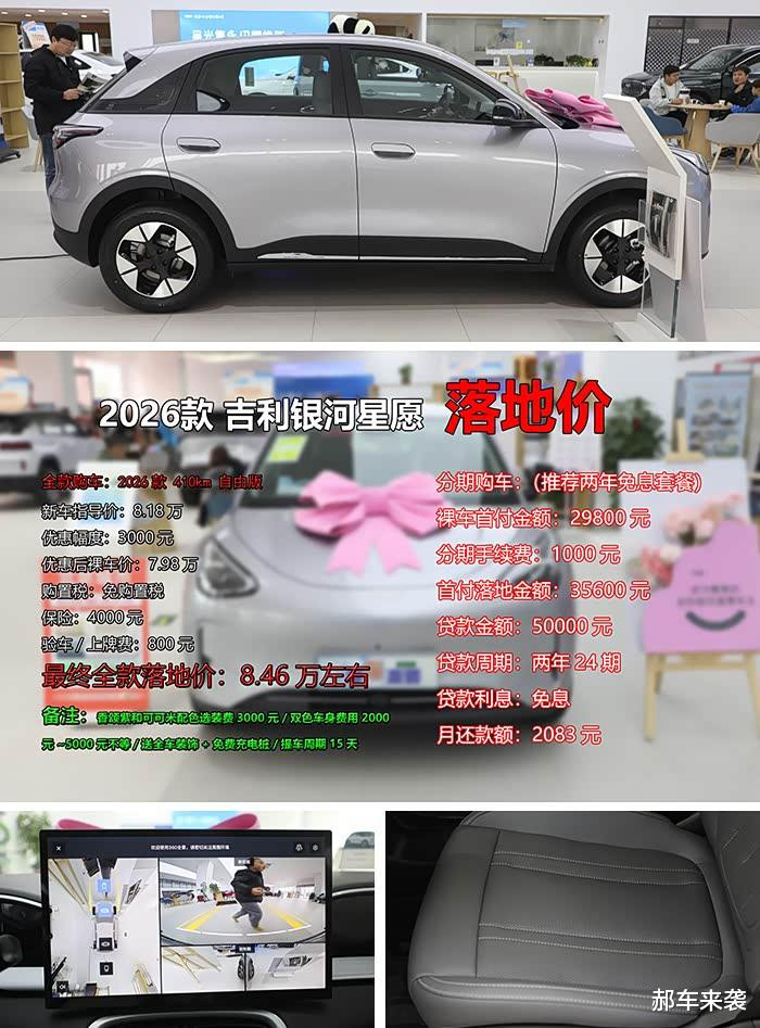 《郝车来袭》总结:相信通过郝哥的介绍,您对2026款吉利银河星愿也有了更深入了解,希望郝哥的分析能为您的购车提供帮助。除此以外,郝哥还根据店内了解到,目前吉利银河其他新车也均有不同程度的优惠,例如吉利银河熊猫优惠4000元、银河星舰7和银河M9优惠10000元、银河E8和银河E5直降8000元以及银河L6售价下调2000元等等,同时刚刚上市的银河星耀6也已到店,新车上市限时指导价区间为6.88万~9.98万元。当然,如果您想知道郝哥探访的是北京地区哪家吉利银河4S店也可以留言或私信给我,我会偷偷告诉你的哦,感谢您关注《郝车来袭》。